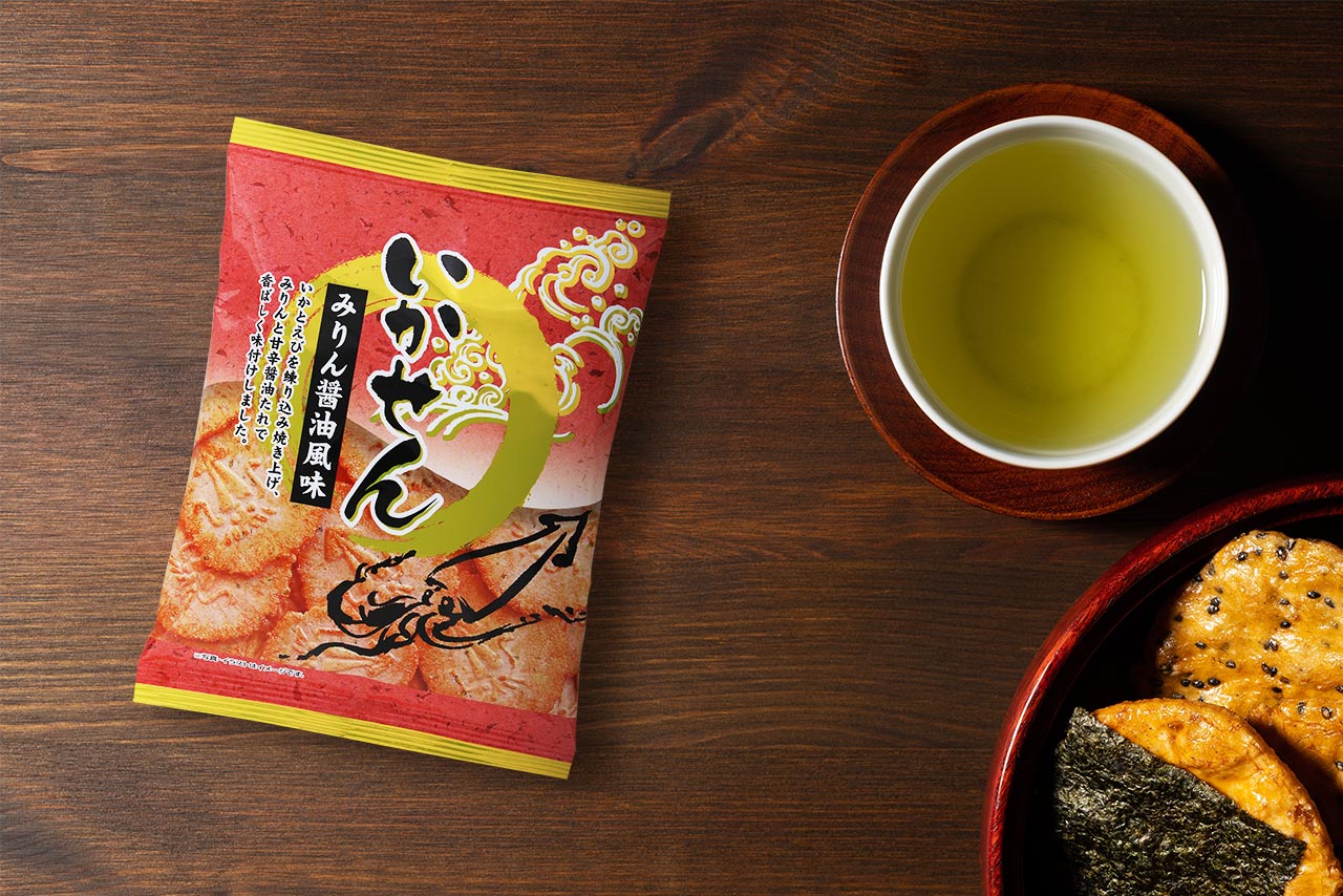 いかとえびを練り込み焼き上げ、みりんと甘辛醤油たれで香ばしく味付けしました。
