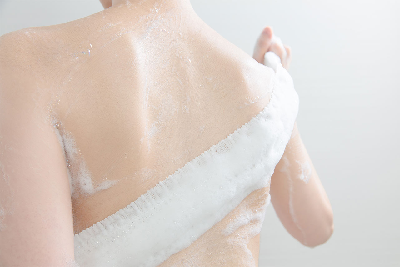 スポンジや手のひらでは難しい背中も くまなく洗えるボディタオル♪