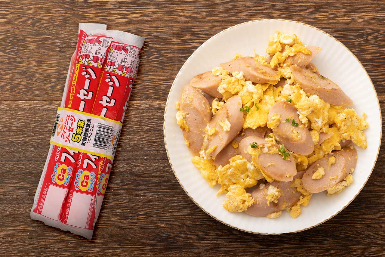 魚肉、結着材料(植物性たん白、でん粉、ゼラチン、卵たん白)、植物油脂、たまねぎ、砂糖、食塩、香辛料/加工でん粉、貝カルシウム、調味料(アミノ酸等)、カルミン酸色素、香辛料抽出物、(一部に卵・小麦・大豆・豚肉・ゼラチンを含む)