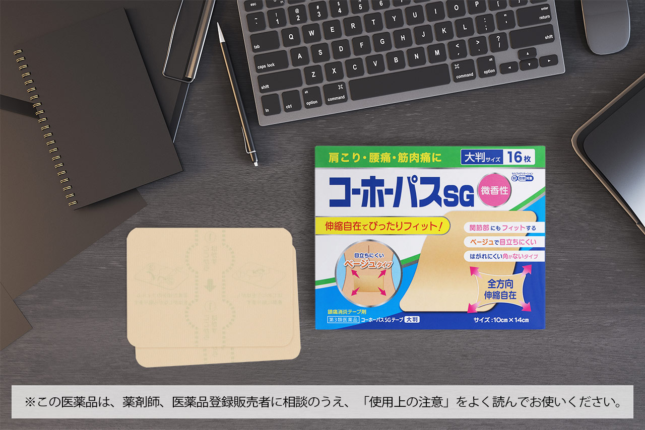 鎮痛・消炎作用をもつサリチル酸グリコール、l-メントールに、 患部の血行を良くするトコフェロール酢酸エステルを配合した大判サイズの鎮痛消炎テープ剤!