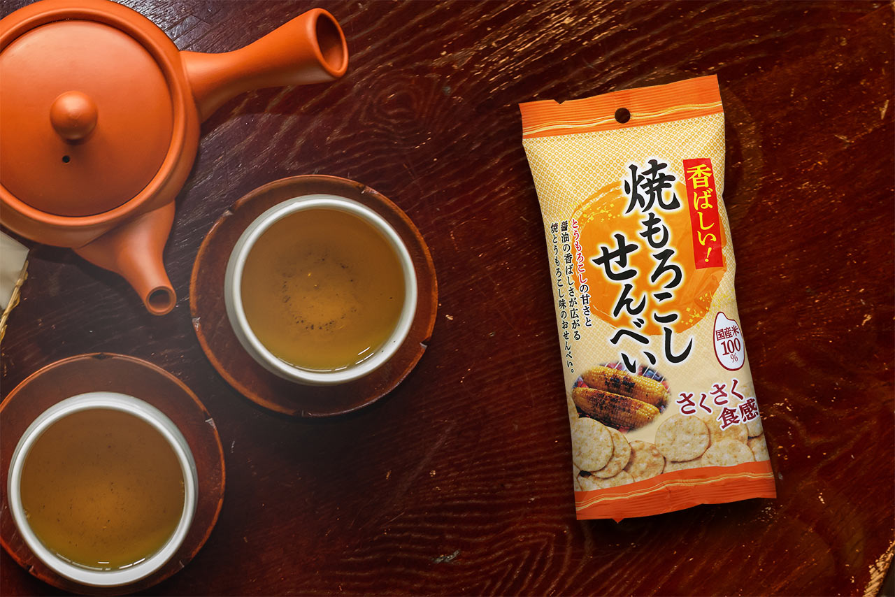 とうもろこしの甘さと醤油の香ばしさが広がる焼とうもろこし味のおせんべい。