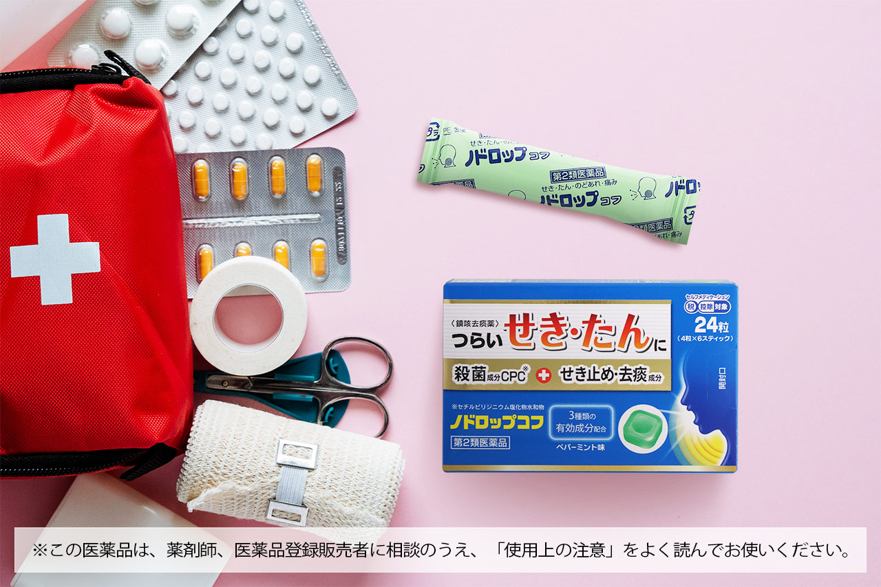 3種類の有効成分を配合。 ●フェノールフタリン酸デキストロメトルファン せき中枢に働きかけを行い、つらいせきを鎮めます。 ●グアヤコールスルホン酸カリウム 気道の粘液分泌を増やし、たんを薄めて排出を促進します。 ●セチルピリジニウム塩化物水和物 殺菌作用を持ち、のどの炎症を抑えて痛みを改善します。 爽快なペパーミント味。 スティック包装で持ち運びに便利。