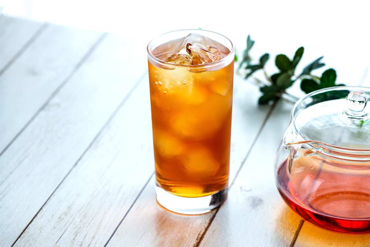 熱湯の量を少なめにして濃くいれ、細かく砕いた氷をたっぷり入れたグラスに注ぎます。