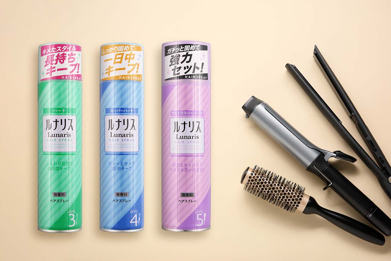 キープレベルが選べるLunaris ヘアスプレーシリーズ。 「ハード」「スーパーハード」「ウルトラスーパーハード」 保湿成分配合で髪の静電気もおさえます。