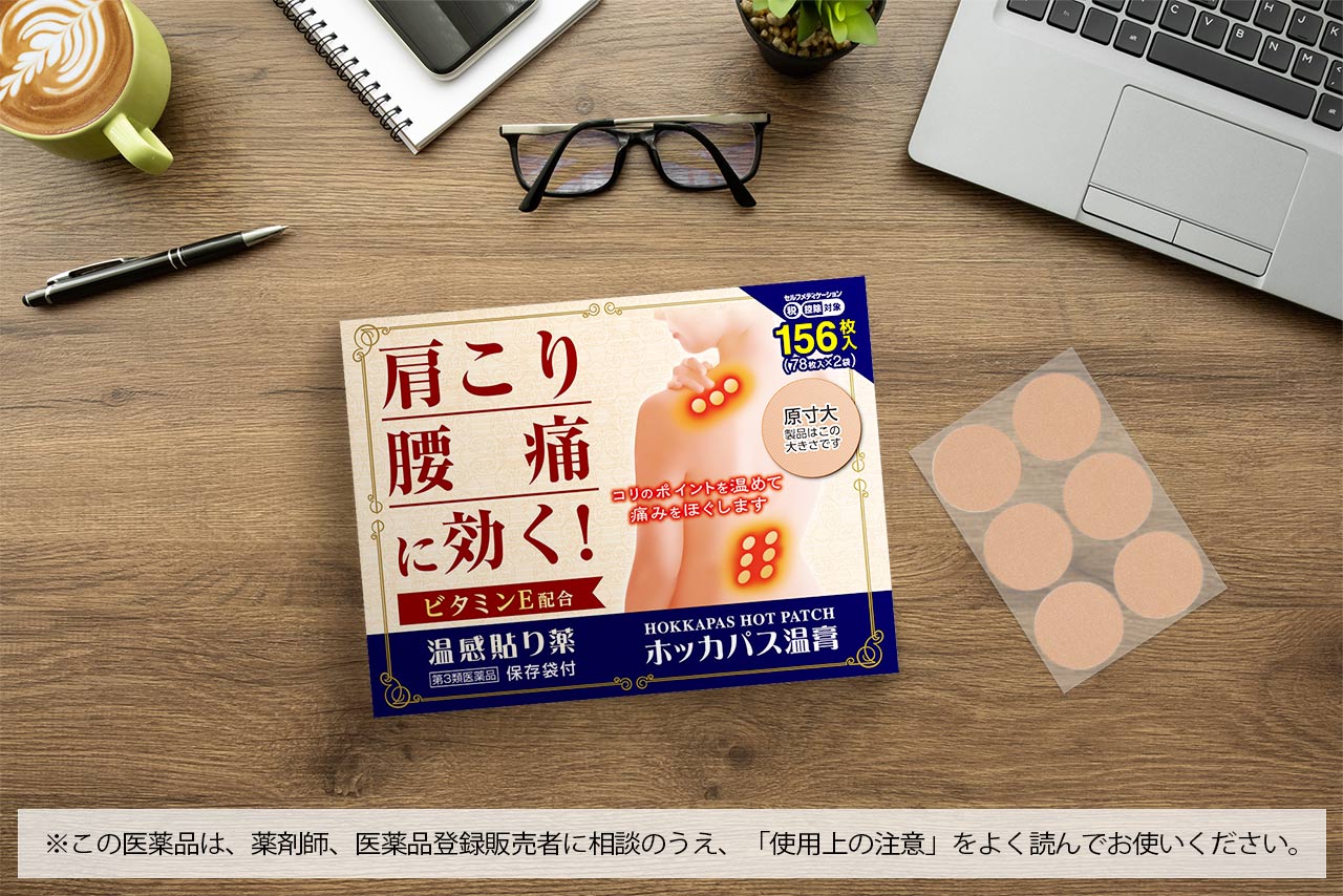 肩、首、背中、腰などの、慢性的なコリや痛みを感じるところに ピンポイントで貼れるパッチ型の温感貼り薬「ホッカパス温膏」