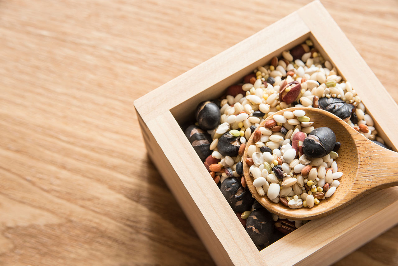 とうもろこし(アメリカ産)、大豆、青肌玄米、黒米、うるち玄米、たかきび、ホワイトソルガム、もちきび、もち玄米、ひえ、アマランサス、黒大豆、もちあわ、緑豆、青大豆、赤米、小豆、金ごま、黒ごま、白ごま、はと麦、緑米