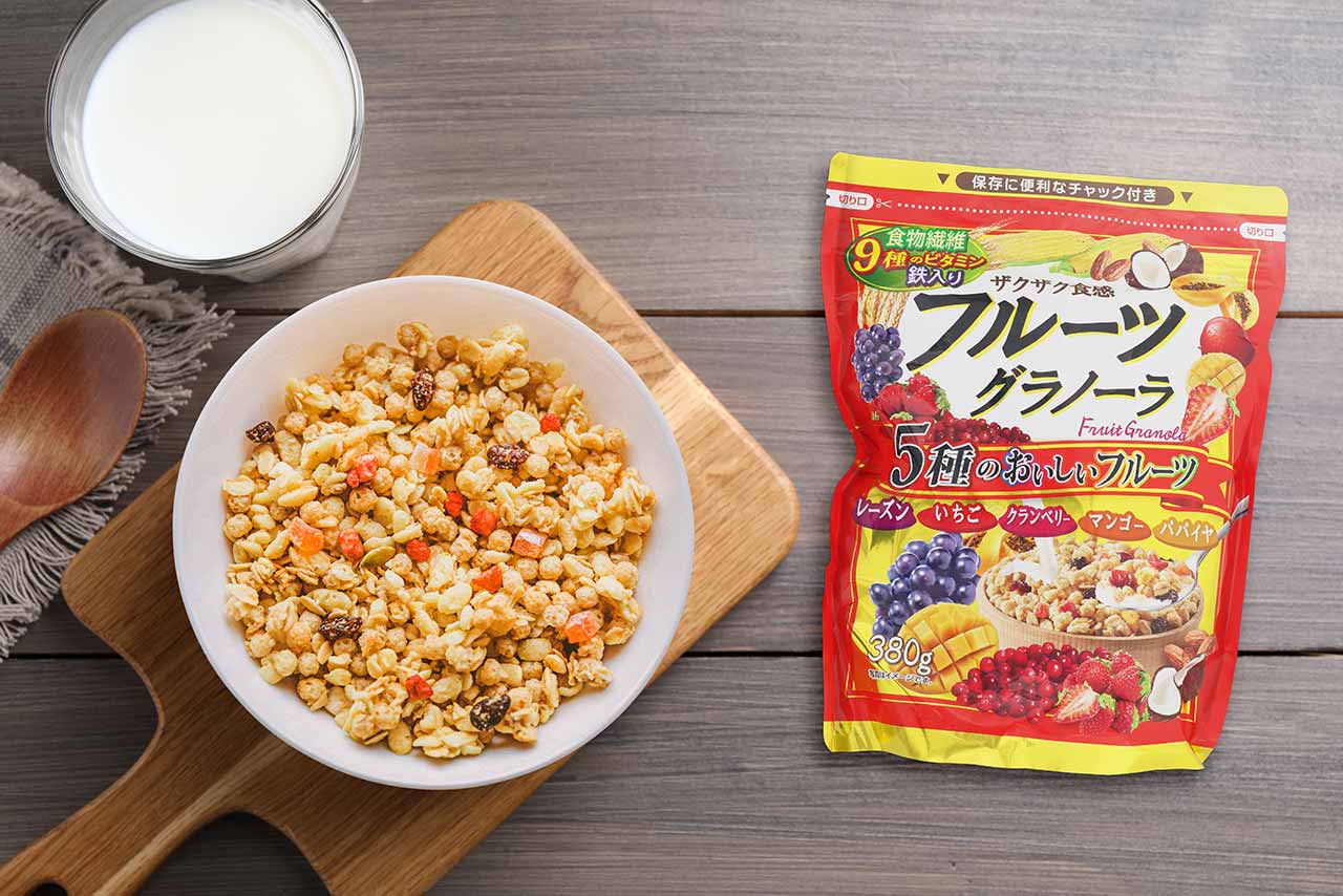 5種のフルーツ、2種のナッツ、5種の穀物で様々な味や食感が楽しめちゃう♪ 噛むほどに満たされるから、しっかり満足できます。