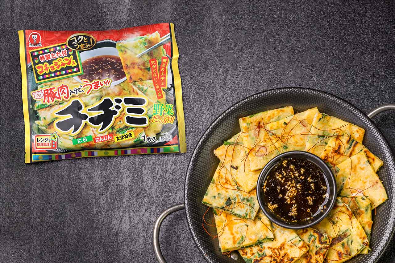【チヂミ】小麦粉、たまねぎ、ねぎ、にんじん、鶏卵、ニラ、豚肉、いか、植物油脂(ごまを含む)、チキンパウダー、ぶどう糖、食塩、しょうが/加工でん粉、調味料(アミノ酸等)、酒精、増粘剤(キサンタン)、香料