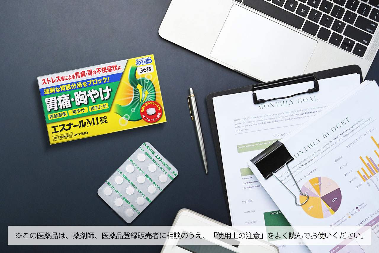 過剰な胃酸は、胃痛や胸やけ、胃もたれなど、さまざまな症状の原因になります エスナールMI錠は胃酸の分泌を抑えつつ、胃を守り消化を助ける胃腸薬