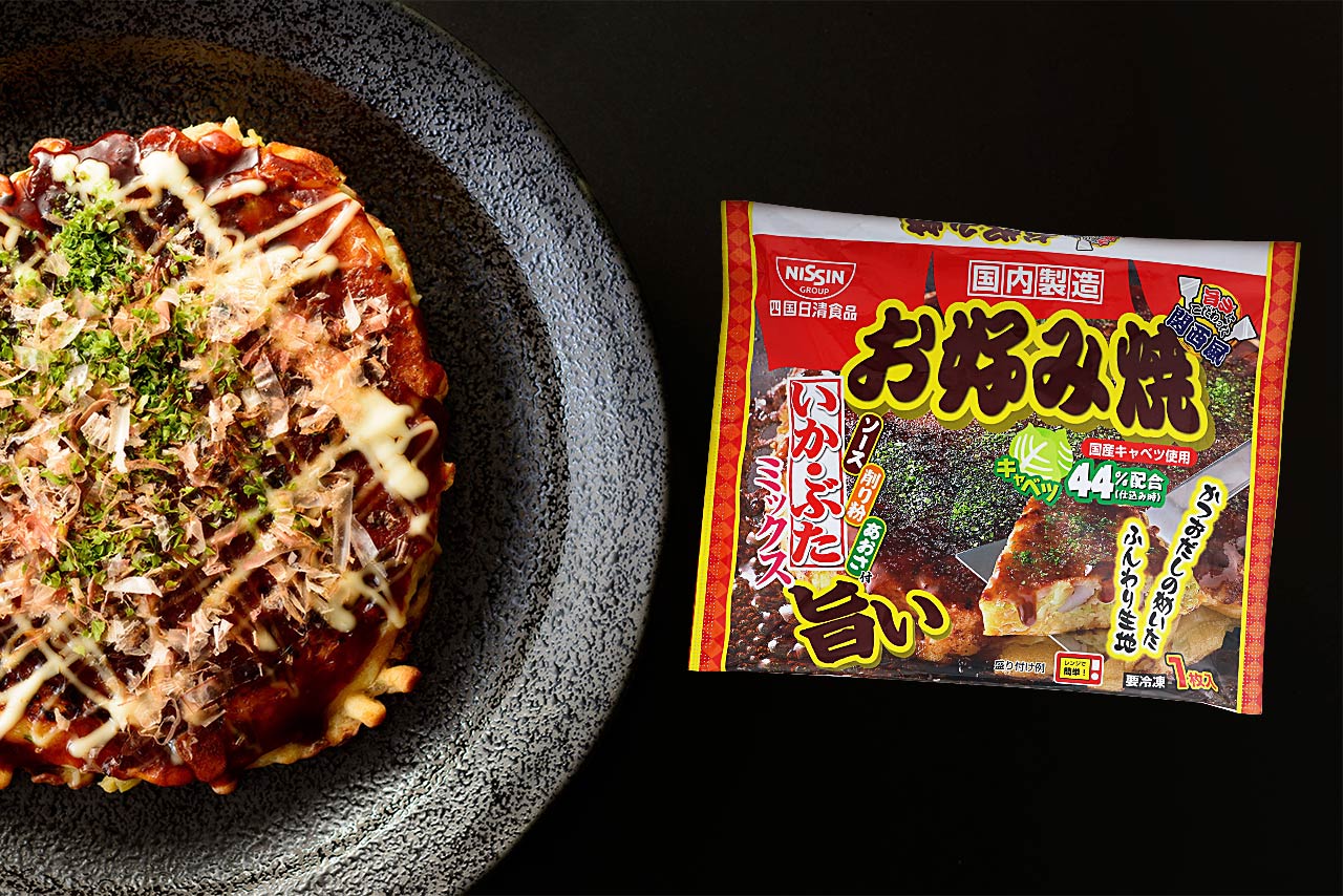 お好み焼{キャベツ、小麦粉、鶏卵、いか、豚肉、砂糖、ビーフオイル、紅しょうが、植物油脂(大豆を含む)、食塩、風味調味料/調味料(アミノ酸等)、増粘剤(キサンタンガム)、酸味料、ベニコウジ色素}、ソース{糖類(ぶどう糖果糖液糖、砂糖、水あめ)、リンゴピューレー、食塩、醸造酢、しょうゆ(小麦・大豆を含む)、トマトペースト、デーツピューレー、オニオンピューレー、香辛料/増粘剤(加工デンプン、増粘多糖類)、カラメル色素、調味料(アミノ酸等)、酸味料}、ふりかけ{削り粉(さば節、いわし煮干し、そうだがつお節、むろあじ節)、あおさ}